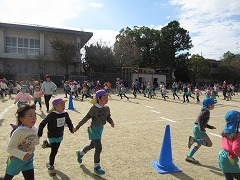 幼稚園のお隣の田辺小学校では、中間休みになると全校児童が校庭に集まり、中間ランニングが始まります。田辺幼稚園の5歳児も参加させてもらい、寒い冬を前に強い体作りです。