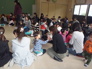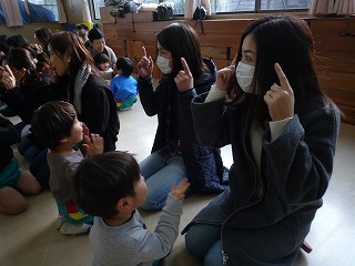 おうちの人とじーっと目を合わせる事が、少し恥ずかしいお友達もいましたが、その恥ずかしいという思いをもつことも、わらべうたで学べることのひとつです。