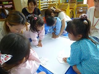 3歳児の子どもたちは参観日で、お家の人とと一緒に紙粘土遊びをしました