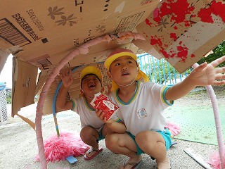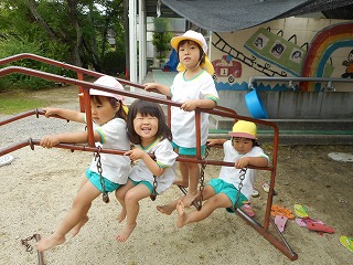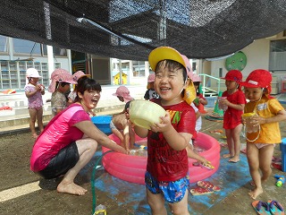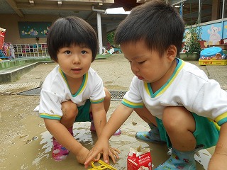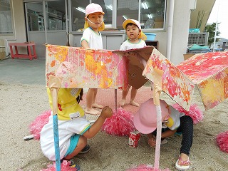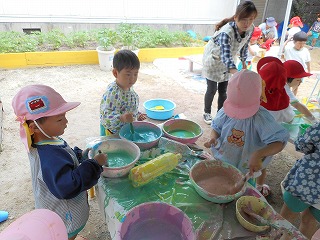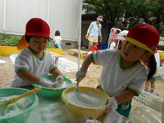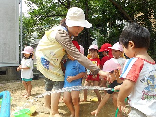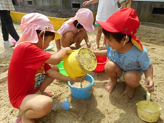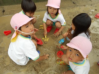 「そこにいるんだれ?」「家みたいやな」とほっこりひと休み。「こんなとこに座れたでー」ゆらゆら橋も得意気ですえのぐと泡の生クリームをまぜまぜ…「チョコのクリームできたで」「これはメロン味」いろんな味ができていますこちらは黙々とふわふわの生クリームを作っていますこの日は雨上がり「チョコレートのおもち!先生食べてみ」「ここおっきいハンバーグ」ペタペタしながら教えてくれています暑い日あそびの服に着替えて遊びます「おっきいプール作ろ!」「うわー冷たい!」と歓声があがっていました水と砂を混ぜて“なにか”を作っています水遊びペットボトルシャワーや水鉄砲で水遊び「きもちいい」と自分でかけたり友達とかけあったり歓声があがっていました水がかかり「やめてよー」といいながらの満面の笑みプール遊びも経験しこの時期ならではの遊びや水に触れて遊ぶ楽しさを感じている年少組さんです