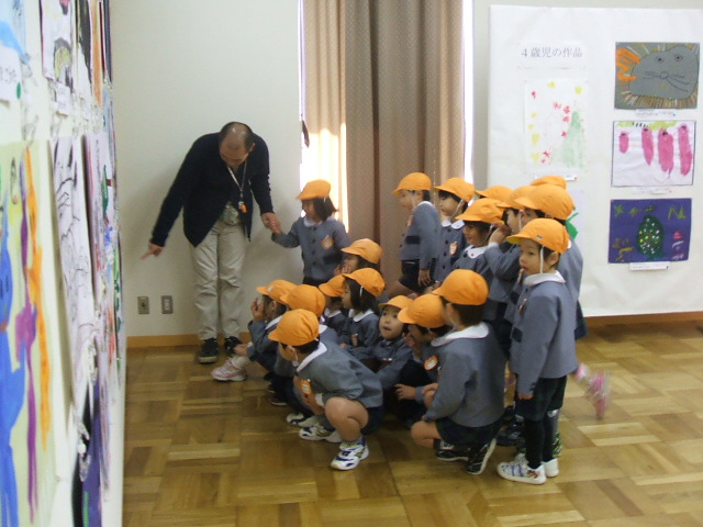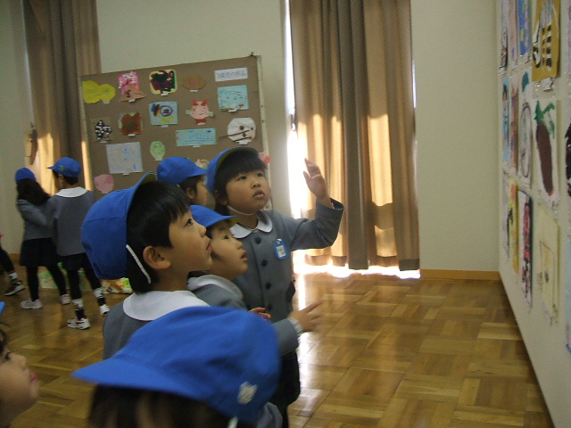 4・5歳児は15日(金)に幼稚園からみんなで見学に行ってきました。「あった!!」と自分の作品を見つけて喜ぶ幼児や、たくさんの友達の作品にうっとり見とれている幼児などの姿が見られました。