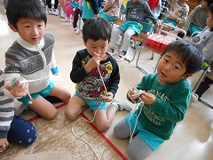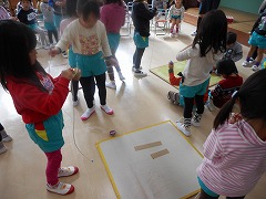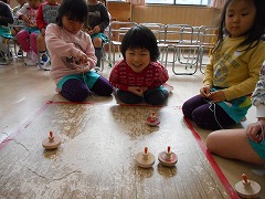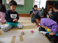 一生懸命にひもを巻いたり、こまを回して遊びました