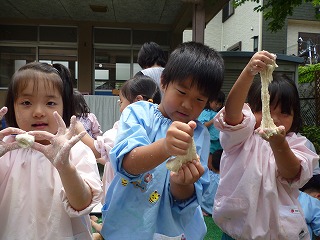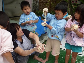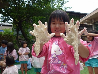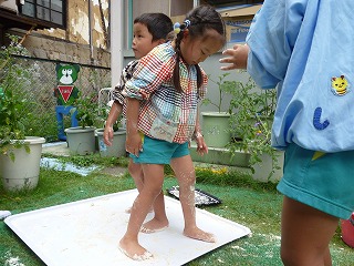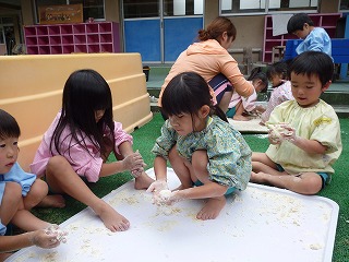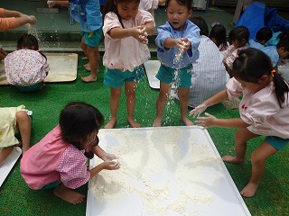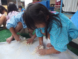 手や足で、思いきり小麦粉の感触を楽しんだ子ども達でした。