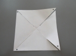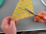 ③次に、折り紙を広げ、折り目にそって切り込みを入れる。(真ん中から約1.5㎝は切らずに、そのままにしておく)