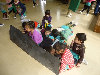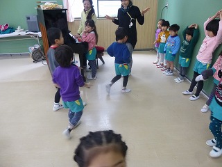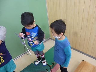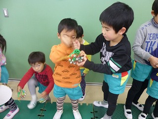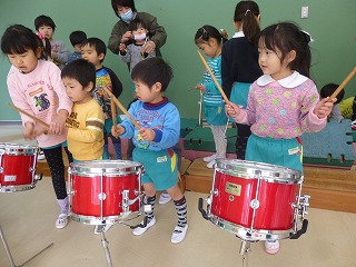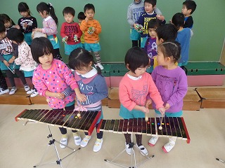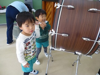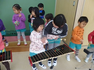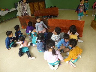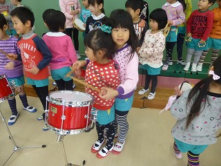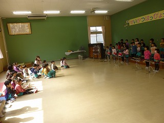 発表会が終わり、年少の子達が年中、年長さんに楽器や劇を教えてもらいました。