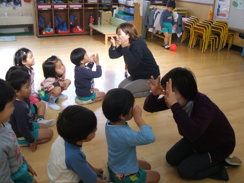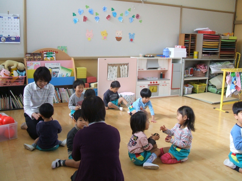 先生や友達と一緒にわらべうた遊びを楽しんでいます。