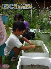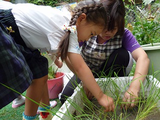 昨日、お米の苗を頂いたので、みんなで田植えに挑戦しました。