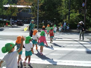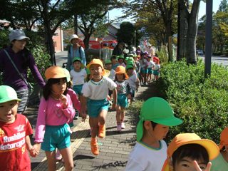 いつもの避難訓練とは違い、3・4・5歳児がみんなで少し遠くまで歩いて避難しました。