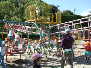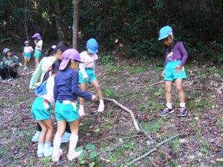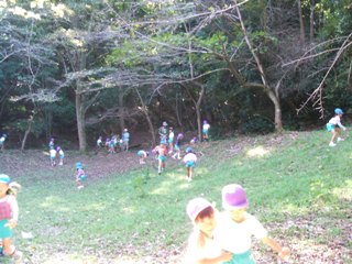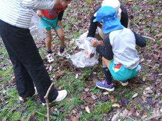 無事避難できた後は、秋の自然を感じながら、飛行機ランドで体を動かして遊んだり、裏山でどんぐりや木の葉などの自然物を集めたりして楽しみました。