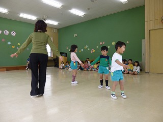 友達と2人組になり、歌に合わせて跳ぶのですが、ペアの友達の目をしっかりと見て跳びます。