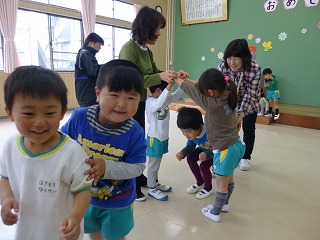 に合わせて、トンネルをくぐっていきます。歌の終わりにトンネルが閉まるため、その時に通った子は、トンネルにつかまるという遊びです。