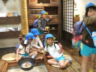 昔のおうちに入っています。「ここでご飯食べるんやー」と実際に座ってみる子ども達。
