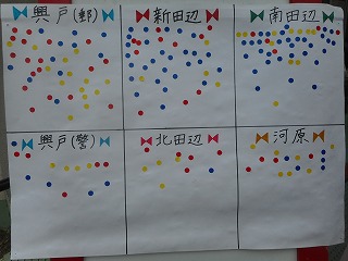 歩いて降園した時には、園長先生からシールをもらい、掲示板の自分の地域の所に貼ります。青色は5歳児、黄色は4歳児、赤色は3歳児です。