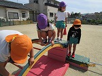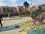 サーキット遊びや登り棒に「できるかな~?」とドキドキしながらも挑戦する姿が! いろいろな形の橋から落ちないように慎重に進んだり、高い巧技台から「あそこまで飛ぶ!」と目標を決めてジャンプしたりしています。