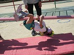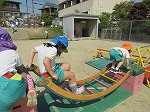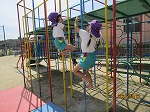 登り棒では、上から降りてくることを楽しんだり、2本使って上まで登ろうとする姿が見られます。「先生!」と呼ぶ方を見てみるといつの間にか上まで登り、嬉しそうに手を振る子どもたちです。
