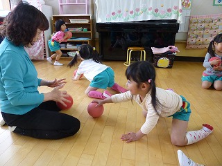 まりをつきます。まりと少し仲良くなれてきたかな?