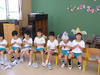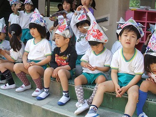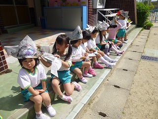 みんながかぶっているかぶとはすみれ、ひまわり組は自分たちで、もも、さくら組のかぶとはすみれ組が折って、自分たちで絵を描きました。