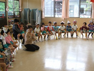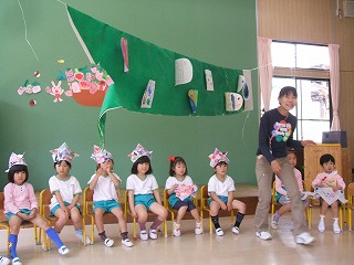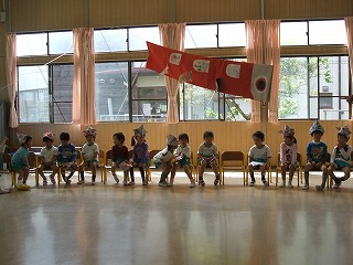 その後ひまわり組とすみれ組はホールに集まり園長先生からこどもの日の由来やこいのぼりに