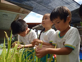 「先生~、剥けた!!」 1粒のモミの皮をむくのに悪戦苦闘していて子どもたちでした。