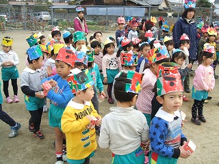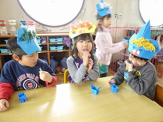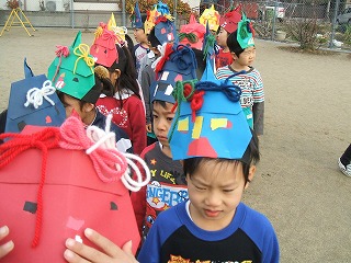 鬼のお面は家に持って帰り、おうちの人が鬼になったり自分がかぶって鬼になったりして豆まきを楽しんだようです。