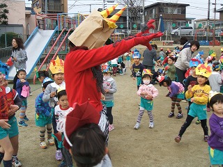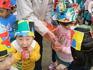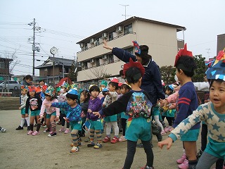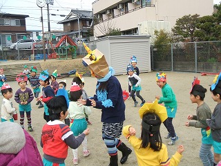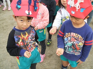何が起こったのか?!きょとんとした顔のお友達でしたが、「あ!おにっ、やっつけなくっちゃ」と元気に豆をまき鬼を追い払いました。