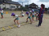 5歳児すみれ組、ばら組の子どもたちは、ぺったんこのはしごのような道具を使っていろいろなステップを楽しみます。
