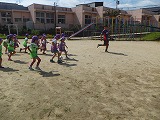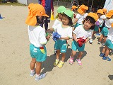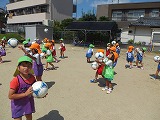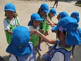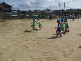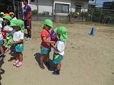 4歳児ひまわり組、ゆり組の子どもたちは、カラーベストを1枚ずつ持って、友達同士交換、交換・・・。自分の持っているものと違う色を持っているお友達を探して、走り回ります。