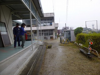 その後、ホールで消化器の使い方を教えてもらい、実際に先生が消火訓練をする様子をみました。