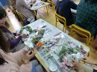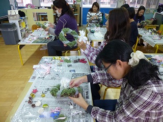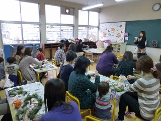 PTAのクラブ・サークル活動の「フラワーアレンジメント」さんが、講師にstrawberry fieldsさんをお招きし、クリスマスリースを作成されました。