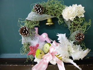 白とピンクの可愛らしいリースが出来上がりました。