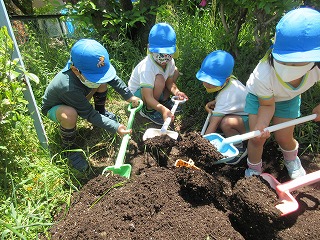そんな話をみんなでしながら、夏野菜「トマト」「ピーマン」「きゅうり」「とうもろこし」を育てるために、まずはみんなで『土づくり』をしました。
