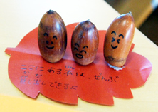 図書室の秋のコーナーに、かわいいキャラクターが置かれていて、子ども達の人気者になっています。
