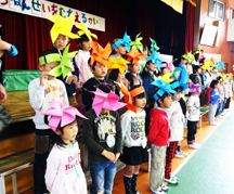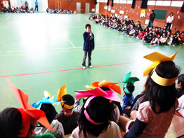 次の写真は、1年生がお礼の気持ちを込めて、歌を歌っているところです。頭に付けているのは、プレゼントとしてもらった風車の帽子です。 走るとくるくる回ります。