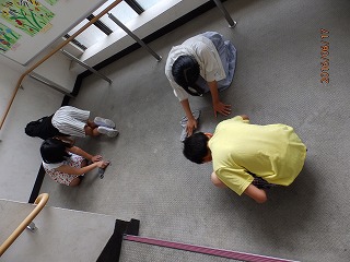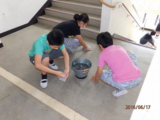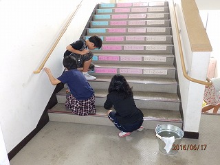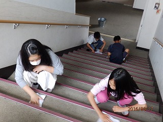 階段の中でも、一番通行が多く、給食の返却などで汚れている南校舎の東階段の清掃です。掃除時間だけでは充分きれいになりにくい汚れを一生懸命ぞうきんでふき取ってくれました。皆の為に頑張っている6年生の意欲をうれしく感じました。このような6年生の姿が、下級生たちの良いお手本となることでしょう。
