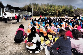 家庭科室からの出火に対して、非常ベルや緊急放送によって素早く避難をすることができました。お隣の田辺東幼稚園と河原保育所の分室の子どもたちも先生と一緒に小学校の運動場に避難をしました。