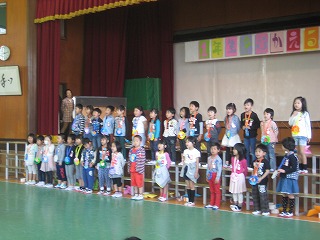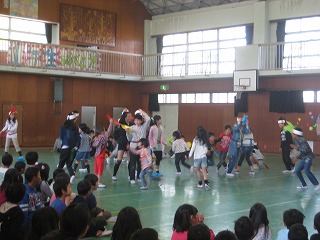 1年生に楽しんでもらおうと、運営委員が中心となって、プレゼントづくりなど全校で取り組みました。全校で「東っ子の歌」を歌った後、クイズや1年生と6年生による「しっぽ取りゲーム」で盛り上がりました。1年生からは、元気にかわいくお礼の言葉と歌をお返ししました。