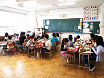 色々な学年が机を囲んで食べていると、自然と高学年の子が低学年の子の面倒を見始めます。良い雰囲気でみんな給食を楽しんでいました。