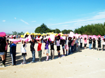 <写真は、子ども達が校章の形に並んでいるところです。子ども達は、黄色やピンク色の色画用紙をもっています。>