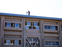 <航空写真の撮影の後、全校児童が並んで記念撮影。地上のカメラマンが、屋上から撮影をしました。全員で、「いち、に、さん、だーぁ!!」と気合いを入れてたりして、楽しい撮影になりました。>