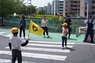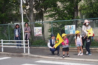 |  | |  | | 交通安全教室1年生4月25日(月)交通安全教室を開催しました。 田辺警察からお越しいただき、登下校時に交通事故などに遭わないように、安全な歩行や横断についてお話を伺いました。その後、幼稚園前の交差点で、手を上げて、「右左右」と車が来ないかよく確認してから、手を上げて渡れるように、一人一人やってみました。今日の練習では、本当に気を付けて良く見ていた1年生ばかりでしたが、これからも交通安全に気を付けてほしいですね。PTAや1年生の保護者、防犯推進委員さんにも来ていただき、お世話になりました。ありがとうございました。