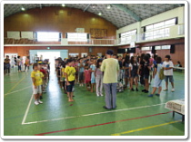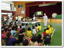 <写真2・3:開会式の様子です。お話しを聞いた後、各コーナーに子ども達は分かれます。>