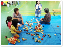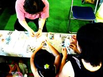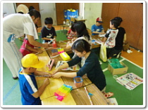 <写真9.10:洗濯ばさみ鉄砲のコーナーです。5年生の役員の方々が担当されました。洗濯ばさみと、新聞広告の紙で簡単に鉄砲が作れます。素晴らしいアイデアです。>
