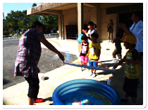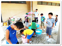 <写真7.8:ジャンボ・シャボン玉。PTA本部役員の方々が担当されました。とても大きなシャボン玉が出来ました。写真では見えにくいのですが、子どもよりも大きいシャボン玉が写っています。見えますか?>