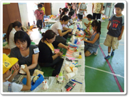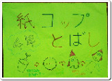 <写真11.12:紙コップとばしのコーナーは、4年生の役員の方々が担当されました。紙コップを輪ゴムの力で飛ばします。安全に楽しく遊べますね。子ども達は、コップに思い思いの絵を描いて、きれいに仕上げていました。>