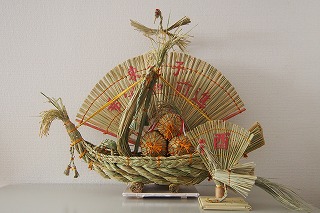 地域の方から頂戴した稲わらで丁寧に作られた「帆掛け船」と「干支の酉」です。