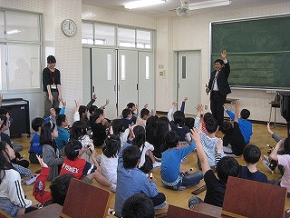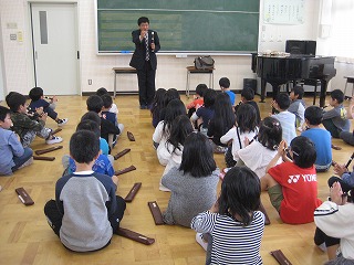3年生、初めてのリコーダー学習で、講師の先生に息の入れ方、タンギングの仕方を教えてもらいました。みんな、早く音を出したくてうずうず。先生の言われたとおりにやって、いい音が出始めました 大きさの違ういろいろなリコーダーも演奏していただきました。