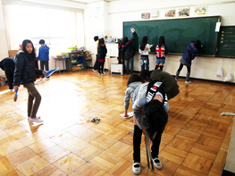 <6年生は、自分たちの使った教室をきれいに掃除していました。>