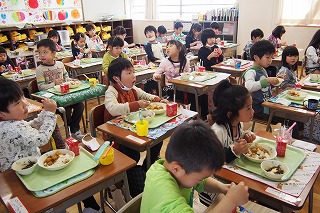 学校では給食を生きた教材として食育を進めています。子どもたちが、「食」を大切にする気持ちや好き嫌いせず残さず食べる態度を養い、心身ともに健やかに育って欲しいと願っています