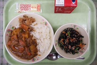 『ビーフカレー・麦入りごはん・ひじきのサラダ・一休漬け・牛乳』
