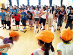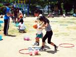 <園庭で、ゲームをしました。すみれ組の園児を運ぶのに、結構 力が必要でした>